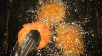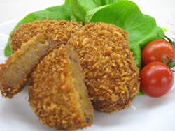 特製ソースとジャガイモをミックスした特製の手作り特製コロッケです。180℃の油でさっときつね色に揚がればできあがりです。